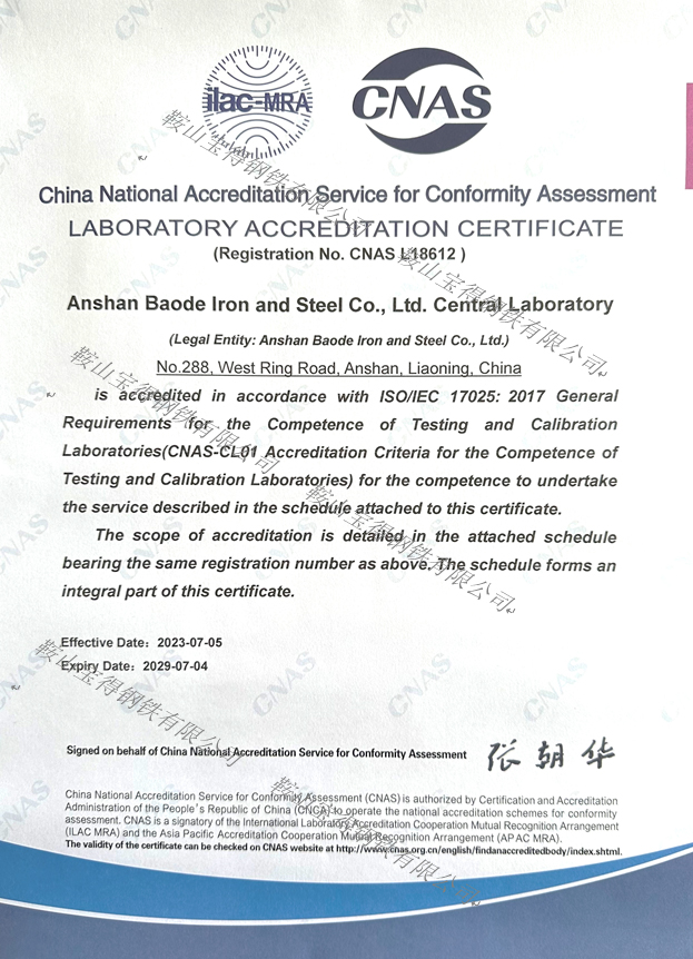 喜訊!鞍山寶得鋼鐵有限公司中心實(shí)驗(yàn)室獲得 CNAS實(shí)驗(yàn)室認(rèn)可證書(shū)